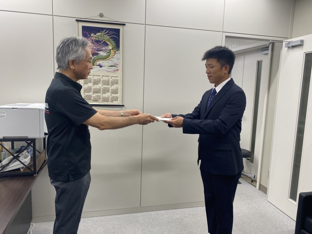 寺尾センター長より辞令を交付される佐藤主任技師(右側)