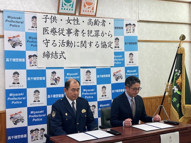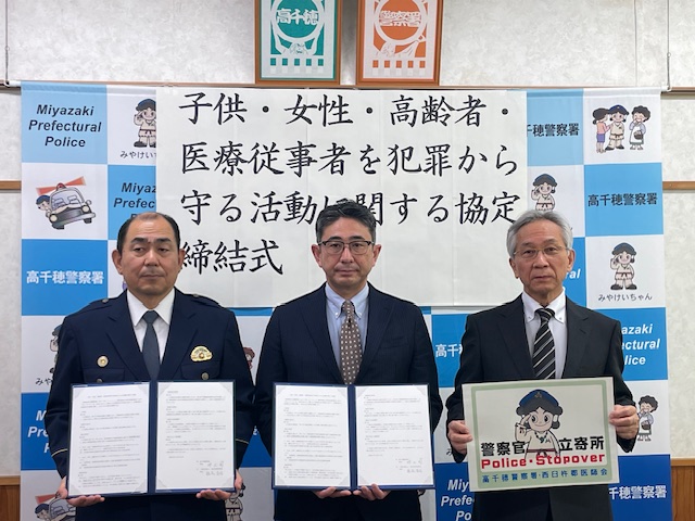 宮崎県高千穂警察署と西臼杵郡医師会(国見ケ丘病院・古賀医院・佐藤医院・高千穂町国保病院・日之影町国保病院・五ヶ瀬町国保病院)では、「こども・女性・高齢者・医療従事者を犯罪から守る活動に関する協定」を締結しました。